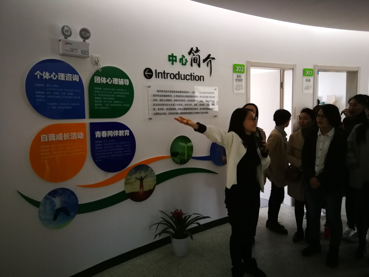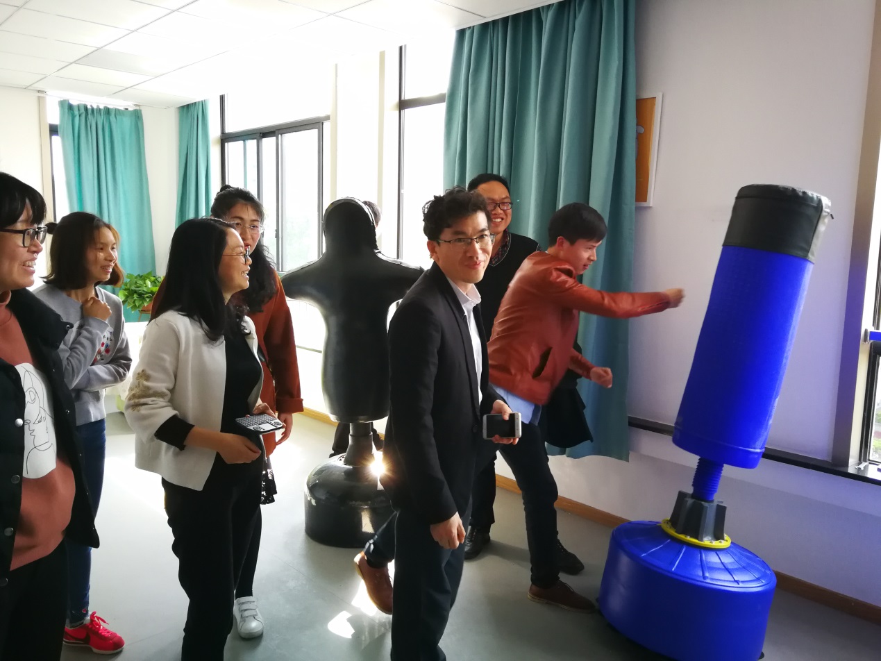 在管老师的带领下,新任教师参观了问吧、放松·咨询吧、沙盘·咨询吧、发泄吧、学习督导吧和团体心理辅导吧等功能区,并体验了各功能室配备的心理专业设备。