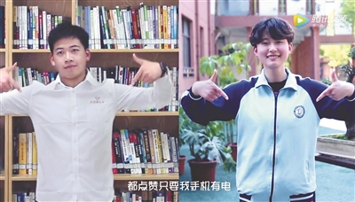 衢职院大学生志愿者侯钱鹏(左)与聋哑学生徐盼(右)参与拍摄公益视频短片《中国很赞,衢州有礼》。