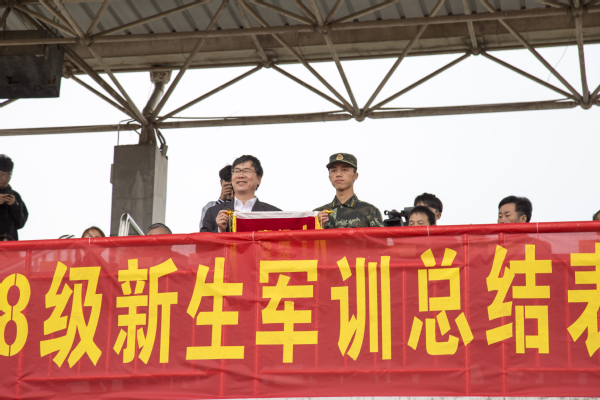 副校长何百通宣读了2018新生军训工作优胜集体、先进个人、优胜排等名单,并由校领导为他们颁奖。