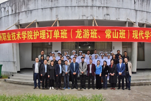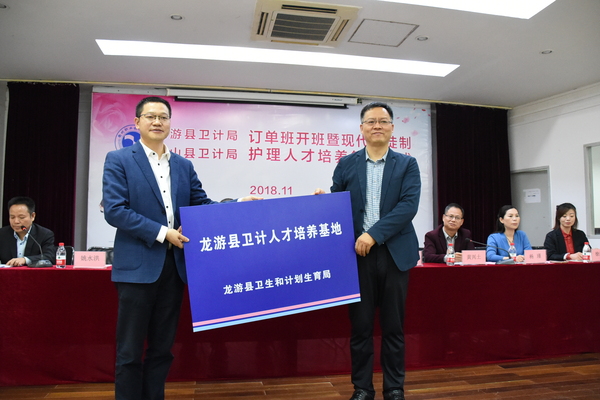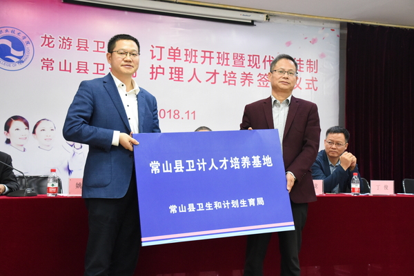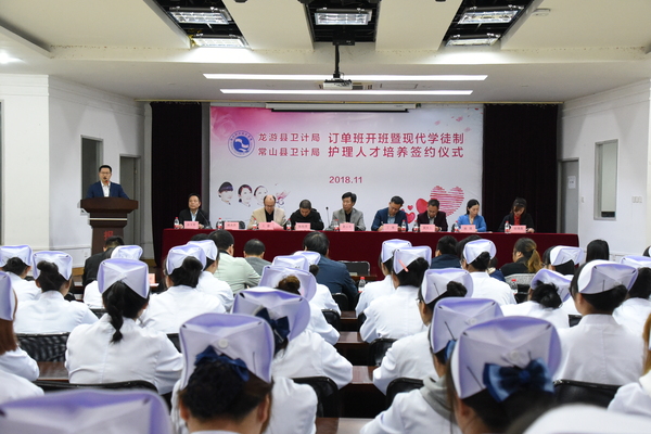 11月7日下午,2018级“龙游班”“常山班”开班暨现代学徒制护理人才培养签约仪式在AK体育客户端艺术楼多功能厅举行。副校长黄云龙、龙游县卫计局局长丁俊、副局长张永华、常山县卫计局副局长黄兴土、龙游县人民医院党总支书记、副院长杨瑾、常山县人民医院保健教育科科长徐瑾鼎等领导参加签约仪式,仪式由医学院党总支书记余文富主持。