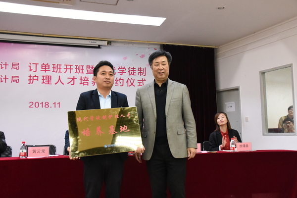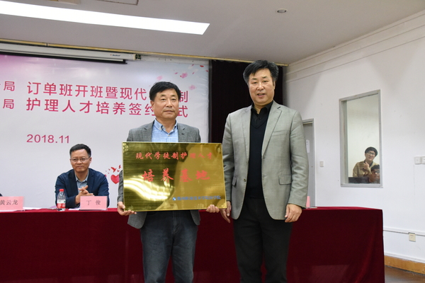 仪式开始,医学院院长姚水洪和两家合作单位主管领导分别作了发言,会上双方签订了订单班护理人才培养协议、就业意向书和师徒确认书等相关合作协议,并授牌“卫计人才培养基地和现代学徒制护理人才培养基地。在场订单班的全体学生在赖晓华老师的带领下庄重的宣誓,表达了对护理事业的热爱与忠诚。