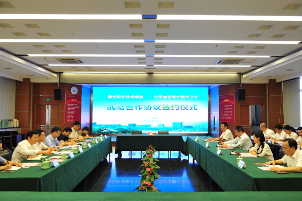 7月10日上午, 学校与中国建设银行股份有限公司衢州分行举行全面战略合作协议签约仪式, 校长江爱民、副校长傅元勋,中国建设银行浙江省分行党委委员、副行长劳新江、机构业务部总经理陈洁,中国建设银行衢州分行党委书记、行长苏继鸿,党委委员、副行长余彬等参加签约仪式。