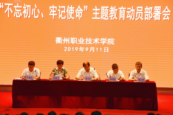 9月11日下午,学校召开“不忘初心、牢记使命”主题教育动员部署会议,深入学习贯彻落实习近平总书记在“不忘初心、牢记使命”主题教育工作会议上的重要讲话精神,严格按照中央、浙江省委和教育部党组对主题教育的部署要求,对全校主题教育进行全面动员与重点部署。省委“不忘初心、牢记使命”主题教育第八巡回指导组组长、省发改委原主任、党组书记谢力群,衢州市委常委、宣传部部长钱伟刚,巡回指导组副组长、丽水市人大常委会原副主任陈志雄及巡回指导组成员出席会议。会议由校长江爱民主持,校党委书记崔戴飞作动员部署。