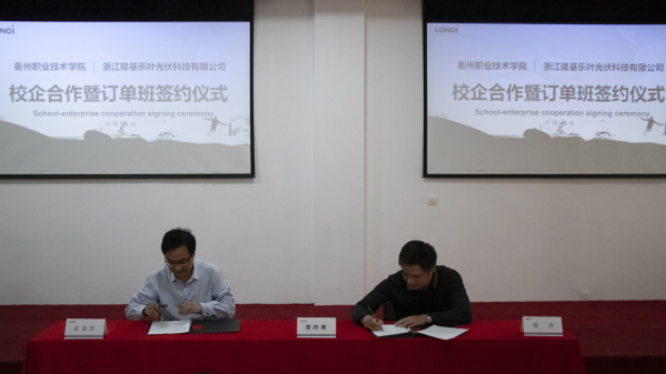 10月18日下午,AK体育客户端与浙江隆基乐叶光伏科技有限公司签订校企合作协议,开展校企全面合作,并开设“隆基乐叶班”。校党委副书记、校长江爱民和浙江隆基乐叶光伏科技有限公司总经理杨小战代表双方为签约仪式致辞,并共同为“AK体育客户端-浙江隆基乐叶光伏科技有限公司校企合作人才培养基地”揭牌。