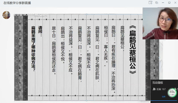 2020年4月8日,首次在线教研活动由医学院朱美香副教授主讲,全校共228名教师参加活动。朱美香以“疫情背景下在线教学BOPPPS教学模式运用——以中医护理学舌诊课为例”为主题,简单介绍了自己主讲的《中医护理学》课程背景,结合舌诊课重点讲解了BOPPPS有效教学模式运用,并分享了在线教学的心得体会。BOPPPS 教学法,以导入(bridge in,B)、教学目标(objective,O)、前测(pre-test,P)、参与式学习(participatory learning,P)、后测 (post-assessment,P)和总结(summary,S)六个模块构成一个完整的教学过程,强调有效的课堂教学设计,简称有效教学模式。