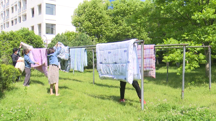 上午10点,阳光正好,在学生宿舍里,几名学校老师正忙着将学生的被子抱出宿舍,一件一件地晾晒在楼下晾晒场的公共晾衣杆上。