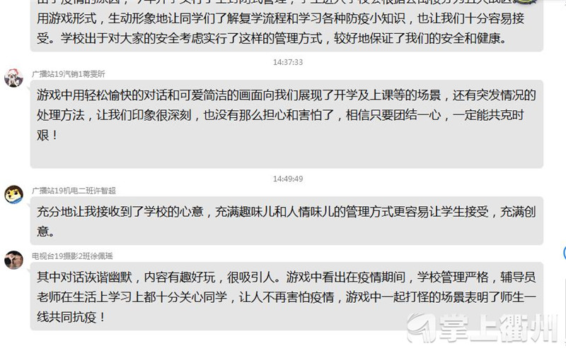 “点赞游戏创意老师的‘接地气’,他就好像我们身边的好伙伴,不得不说:懂我们的小心思呀!不得不夸一夸,设计者也是个有趣的灵魂,几乎每一个情节对话,都让我哈哈大笑。”经常结合网络热点蹦出几条00后们的日常用语,将其视为与00后学生社交的“通行证”,一直是衢职院学工老师们实现学生管理、思政教育与学生群体深度融合的方式,增强了学生工作的吸引力和针对性。