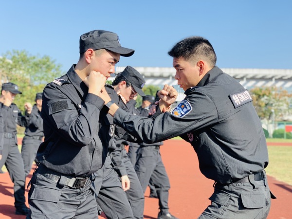 “出拳一定要果断,而且要用腰、胯发力,用身体的爆发力把拳头‘送’出去,打出的拳才不会软绵绵。”程腾亲身示范,然后一遍遍耐心纠正学员们的动作。身穿定制辅警作训服的大男孩们满脸汗水,在烈日下一遍遍重复着枯燥的动作。在接下来的几个小时内,他们还练习了前滚翻、擒拿技巧等一些徒手格斗的“基本功”。这一堂课,一上就是一个下午。