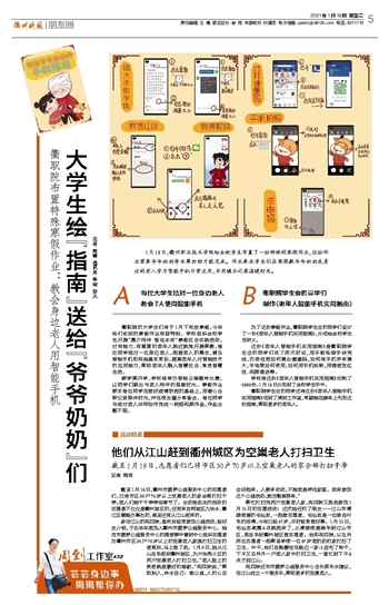 衢职院的大学生们将于1月下旬放寒假,今年他们收到的寒假作业有些特别。学校组织全校学生开展“晨夕相伴 智迎未来”寒假社会实践活动,对有能力、有意愿的老年人就近就地开展帮教,每位同学结对一位身边老人,根据老人的需求,普及智能手机和网络基本常识,提高老年人对智能技术的应用能力,帮助老年人融入智慧社会、享受智慧生活。