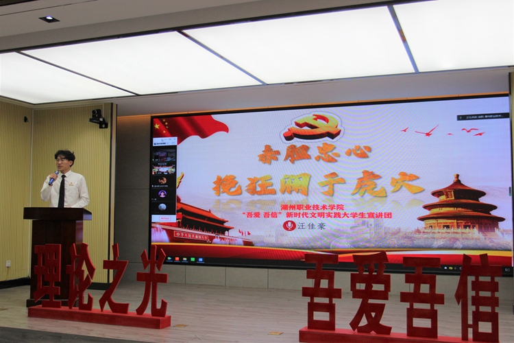 湖州职院“吾爱 吾信”新时代文明实践大学生宣讲团成员汪佳豪同学在进行宣讲