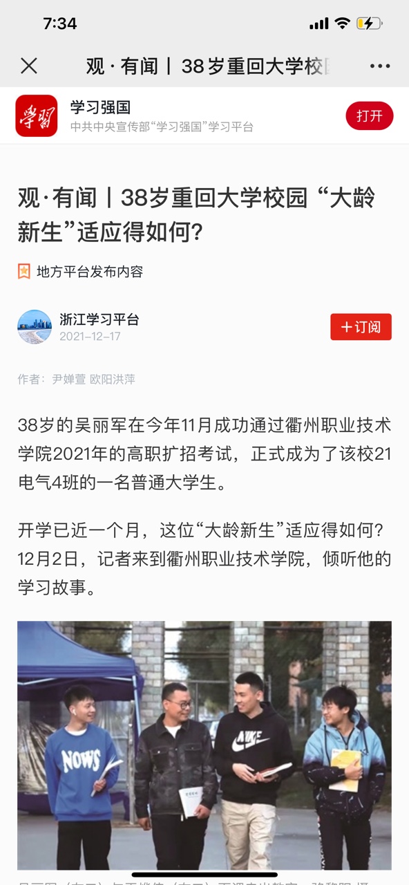 38岁的吴丽军在今年11月成功通过AK体育客户端2021年的高职扩招考试,正式成为了该校21电气4班的一名普通大学生。