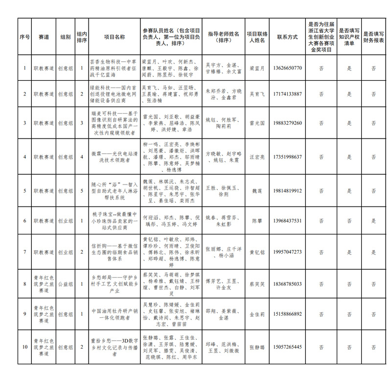 根据《浙江省大学生创新创业大赛组委会关于举办“建行杯”第八届浙江省国际“互联网+”大学生创新创业大赛复赛的通知》精神,经过校内选拔赛专家评审,结合省组委会下发的复赛名额,现将拟推荐参加省级复赛的项目进行公示。公示时间为2022年6月9日-11日,共3天,联系电话:8068936、8069123。