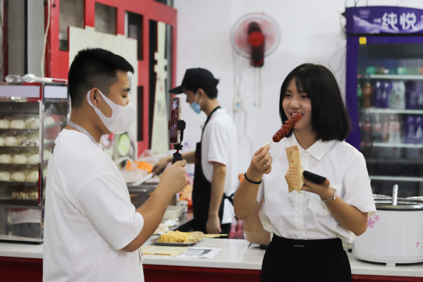 “叔叔阿姨们都很热情,很关心学弟学妹们今后的学习生活环境,在评论区通过弹幕问了我不少问题。”信息工程学院学生会主席团成员叶敏欣化身本次迎新主播,“不会吃辣也没事,食堂有很多其他地方的美食小吃,有广东煲仔饭、四川麻辣烫、安徽酱香饼、缙云烤饼、韩式炸鸡。。。”叶敏欣与新生家长边走边聊,一起参观了教室、实训室、寝室、食堂、图书馆、运动场等区域,团队准备充分、讲授精彩到位,“这是我们学院的何胜军老师团队研发的可视医疗内窥镜产品,这款产品专利权也是何老师团队所有,药监部也颁布了经营许可证,也投入规模生产了,何老师的公司现在年收益超2000万,目前有近40位学长学姐在公司上班,待遇也很不错,公司离学校两三公里,学弟学妹们只要愿意,都可以来实习实践。家长们大可放心,我们职业教育作为一种类型教育,与本科教育只是形式不同,侧重点不同,不存在层次上的差异,我们很注重学生技术技能的培养,只要用心学得一技之长,就业不成问题。”团队考虑到家长们长期以来形成的职业院校低人一等的错误观念,把学院专业建设、师资力量、学生创业就业等情况都作为直播的重要内容。
