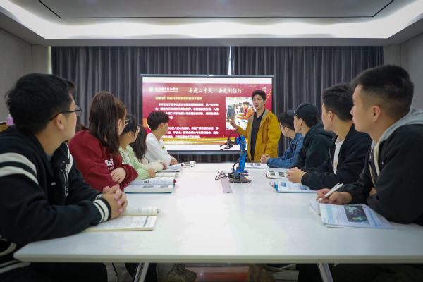 10月18日,AK体育客户端信息工程学院教师高野在课堂上向学生传达习近平总书记关于科教兴国,人才强国相关的重要论述,还与大家分享身边的技术能手事迹。(本报通讯员 欧阳洪萍 摄)