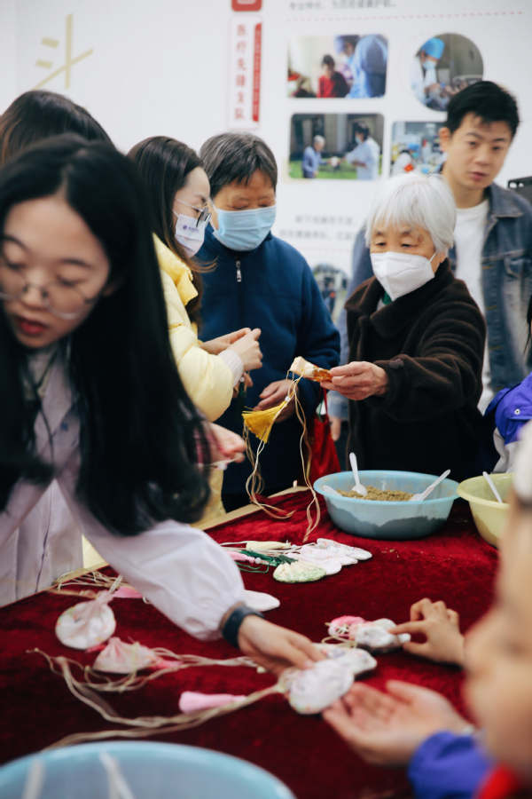 在康养助老区,衢职院医学院的师生志愿者教老人制作安神香囊并普及养生知识。香囊里的安神香都是医学院的老师用中药调配的。