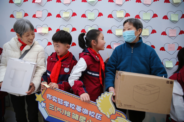 衢州市实验学校菱湖校区三(5)班雏鹰小分队的杜婧怡和同学们参加合唱表演,看到心愿墙上一位奶奶写着想要电饭煲,便拿出自己的零花钱给奶奶买了一只电饭煲,现场交给了这位奶奶。