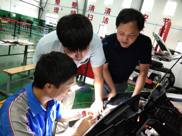 “如今的汽车行业已经向着精益化、数智化、现代化智能制造技术方向升级,现在的维修必须要涉及到一整套完整的诊断思路,要用到一整套现代化诊测设备。”余富忠说,给车维修诊断就像给病人看病,通过汽车尾气分析检测仪给“病人”化验“大小便”,通过示波器检测电路波形分析“病人”的“心电图谱”…… 通过一系列的定性定量检测和数据分析,最终形成一套完整的故障诊断思路。为了填补自动化理论知识领域这片空白,提升相关专业性和技能性,余富忠始终坚持在“临床一线”,在学校校中企“衢州市光大汽车服务有限公司”兼任技术总监,基本没有周末和节假日,他的心思都在汽车上,“每次厂家给我们做培训,他就是‘十万个为什么’。”衢州市光大汽车服务有限公司总经理徐悦说,学习新技能时,余富忠“永远是最爱提问的那一个”。他总是随身带笔记本,把问题和答案详细写下来,学会了,再对每一个向他提问的人倾囊相授。他总是每天早早就出现在车间,了解每个班组的工作情况,检查工艺和技术操作情况,对发现的问题及时纠正止损,遇到哪个岗位忙碌,他就及时顶上去。于是,多年来,衢州市汽车维修服务行业里开始盛传一句“行话”,“有难题,找余富忠啊”。