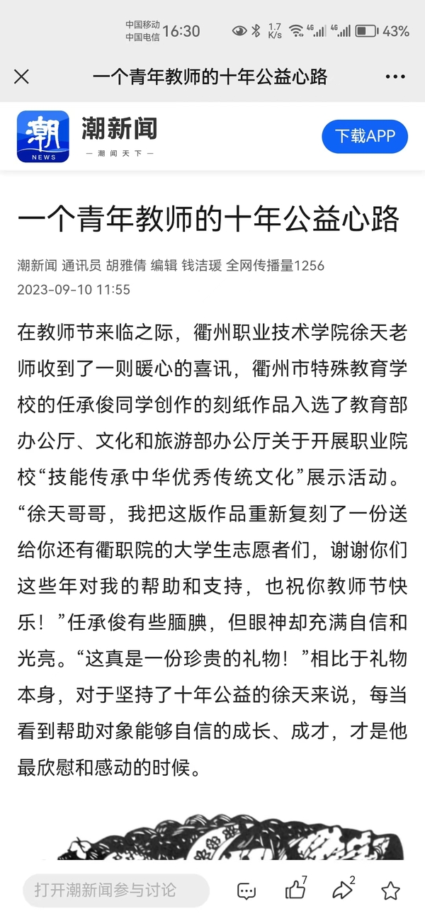 在教师节来临之际,AK体育客户端徐天老师收到了一则暖心的喜讯,衢州市特殊教育学校的任承俊同学创作的刻纸作品入选了教育部办公厅、文化和旅游部办公厅关于开展职业院校“技能传承中华优秀传统文化”展示活动。“徐天哥哥,我把这版作品重新复刻了一份送给你还有衢职院的大学生志愿者们,谢谢你们这些年对我的帮助和支持,也祝你教师节快乐!”任承俊有些腼腆,但眼神却充满自信和光亮。“这真是一份珍贵的礼物!”相比于礼物本身,对于坚持了十年公益的徐天来说,每当看到帮助对象能够自信的成长、成才,才是他最欣慰和感动的时候。