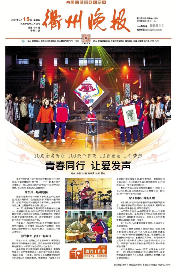 身有残疾的高三学生陈乐阳在AK体育客户端(以下简称衢职院)圆了梦——开了一场属于自己的演唱会。昨天,他还不断收到“粉丝”们给他发来的信息,有祝贺的,有感动的,有鼓励的……