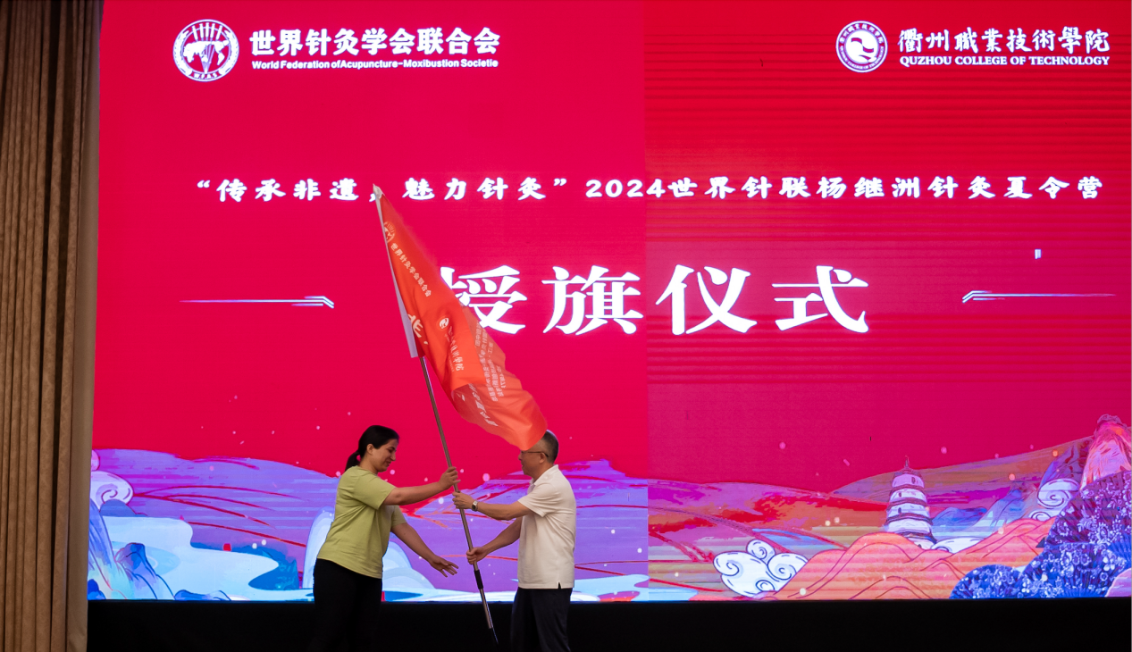 傅根友为2024世界针联杨继洲针灸夏令营授营旗。