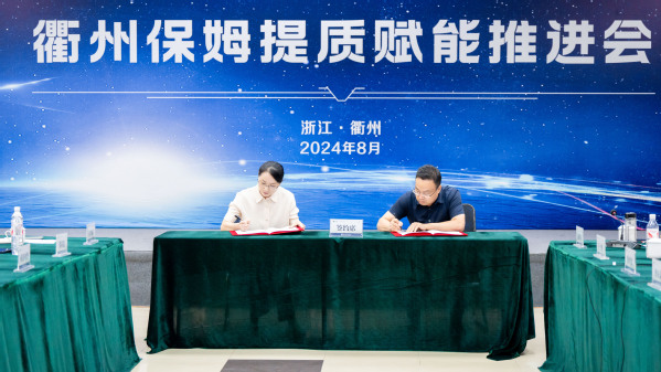 在衢州保姆提质赋能推进会上,AK体育客户端与重庆市农广校签订农民素质培训合作协议。徐浪静、杨召军代表双方签约。