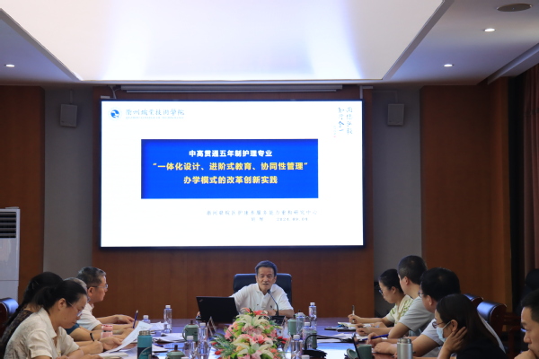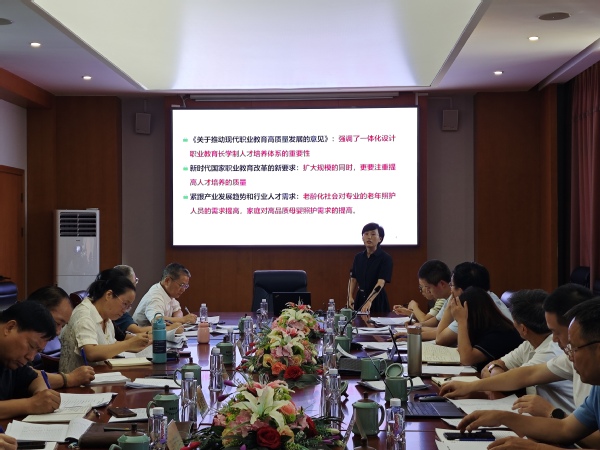 老年护理专业主任史路平汇报五年制中高职一体化护理专业人才培养方案修订情况,与会人员展开热烈研讨。