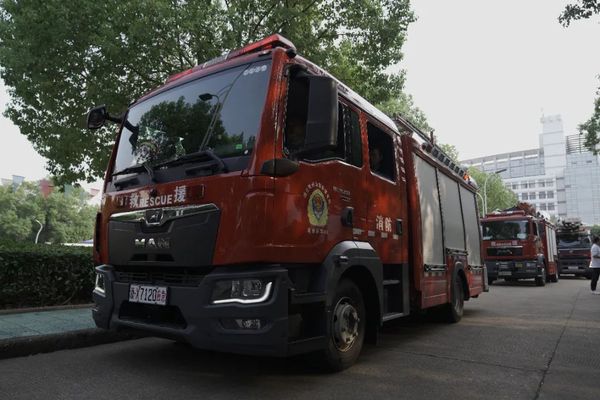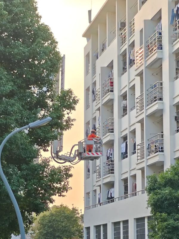 在3号学生公寓4层阳台发现被困学生,消防救援登高车迅速开展救援,将被困学生救至安全地带。