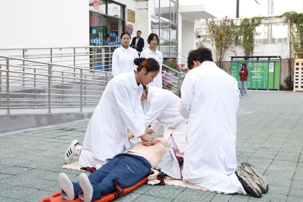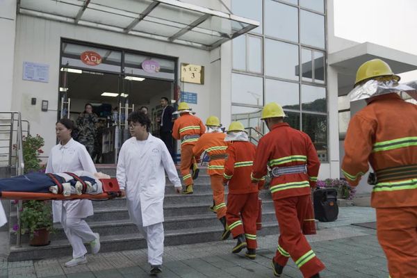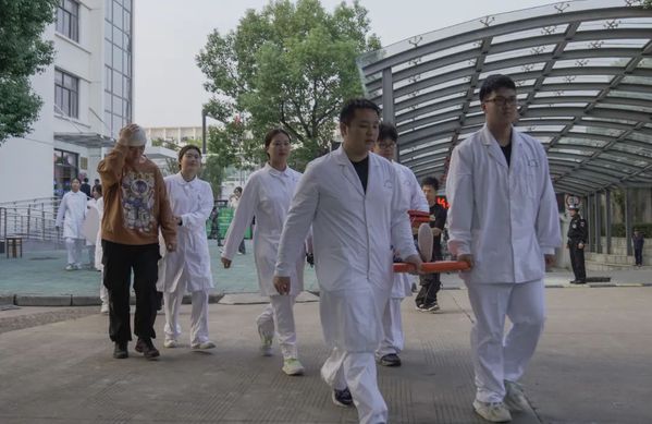 在医疗救护演练中,医护人员对抢救出来的2名“伤员”进行现场包扎,同时另外4名医务人员用担架将“伤员”抬到指定地点,对“伤员”进行心肺复苏救治等。
