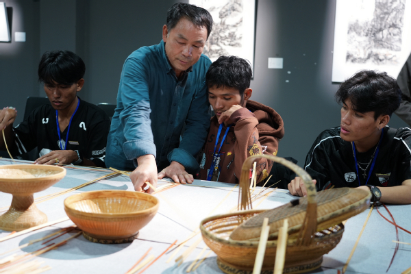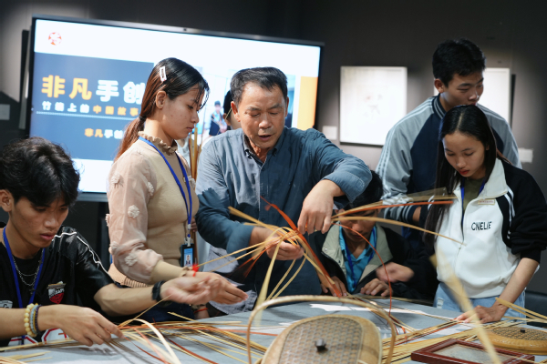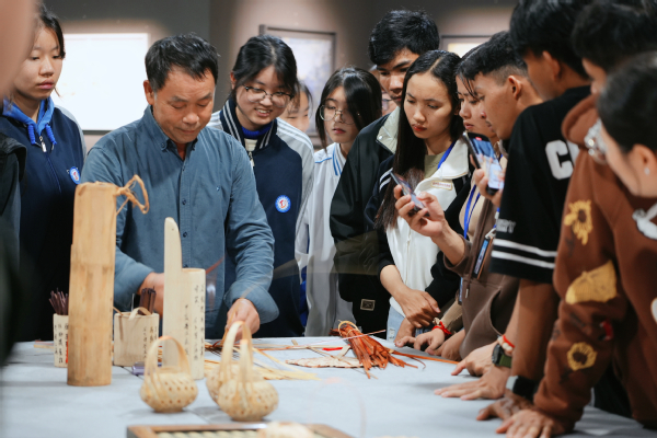课堂上,AK体育客户端英语老师和学生忙碌地穿梭其中,他们是文化交流的桥梁。他们用流利的英语,将竹编文化的魅力传递给柬埔寨留学生。