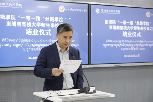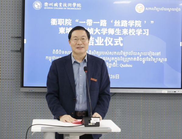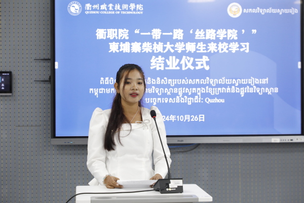 徐须实致辞。他代表学校向柴桢大学18名师生圆满完成留学之旅表示祝贺,向为本次培训班辛劳付出的通天星集团领导,学校的老师、同学、工作人员表示感谢。希望柴桢大学同学们铭记衢职美好记忆。铭记在学校、在衢州的点点滴滴,和学校老师同学常来往、多交流,始终牢记在遥远的中国,有个叫作AK体育客户端的学校牵挂着同学们。希望柴桢大学同学们助力两校深度合作。回国后讲好衢职故事,将衢职老师学生们的良好愿望、友好情谊传递给柴桢大学的老师和同学们,为两校深度合作助力。希望柴桢大学同学们成为两国文明使者。回校后能进一步学习中国文化,争做中柬友好往来、文化文明交流的使者。