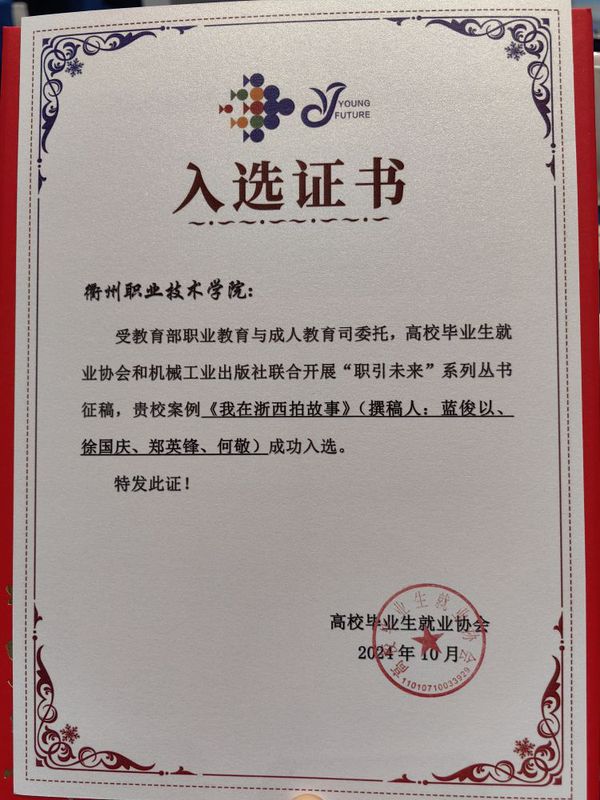 据悉,《职引未来》丛书征稿活动由教育部职业教育与成人教育司委托高校毕业生就业协会和机械工业出版社联合开展,活动得到了全国高职院校的高度重视和积极申报。经院校申报、编辑出版部门推荐、专家评审等程序,AK体育客户端案例《我在浙西拍故事》从全国四百七十篇候选文章中脱颖而出,历经三轮修订,并最终确认为首批入选的九十七个案例之一。《职引未来》丛书计划于2025年上半年由机械工业出版社正式出版。