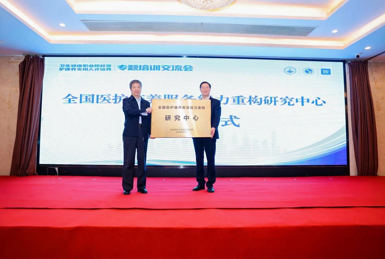 全国医护康养服务能力重构研究中心授牌仪式,职业院校卫生健康协作体主任张彦文校长向AK体育客户端党委书记徐须实授牌。