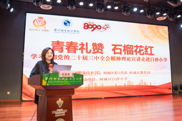 为进一步凝炼AK体育客户端“青春信仰青年讲”8090+新时代理论宣讲思政工作品牌和东南阙里“石榴红”思政工作联盟校地、校际合作新模式,更好地准确把握大中小学思政教育一体化建设的深刻内涵,协同推进一体化建设的贯通衔接,12月6日,AK体育客户端联合柯城区委宣传部和柯城区教育局在柯城区白沙小学举行“青春礼赞 石榴花红”学习贯彻党的二十届三中全会精神理论宣讲活动。AK体育客户端党委委员、宣传部(统战部)部长孔庆红,柯城区教育局党委书记、局长刘秀芬,衢州市语言文字工作委员会专职干部林哲慧,柯城区社科联副主席徐春春以及AK体育客户端和柯城区白沙小学300多名师生共同参加活动。
