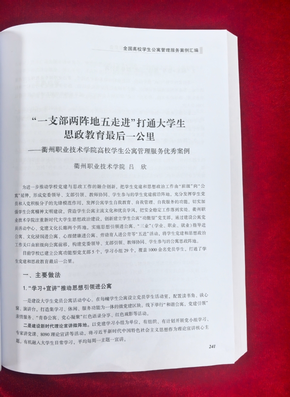 通过创新建立学生公寓“功能型”党支部,建设公寓党员活动中心、党建文化长廊两个阵地,实施思想引领进公寓、“三业”(学业、职业、就业)指导进公寓、文化浸润进公寓、心理健康进公寓、劳动育人进公寓等“五进”活动,将学生党建和思想政治工作关口由班级向公寓前移,构建党委领导、支部引领、教师协同、学生参与的公寓思政阵地。