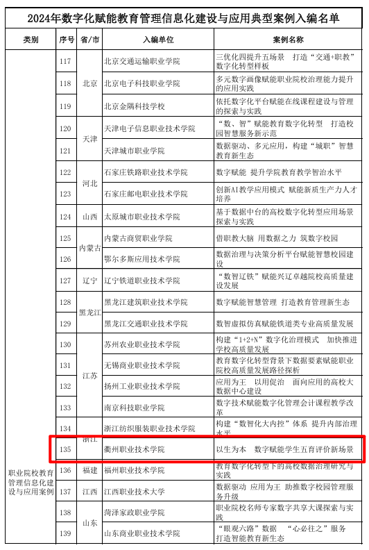 12月5日,教育部教育管理信息中心发布了《2024年数字化赋能教育管理信息化建设与应用典型案例》,AK体育客户端《以生为本,数字赋能学生五育评价新场景》案例成功入选。全国入选职业院校教育管理信息化建设与应用案例共40项,其中浙江省职业院校仅2项。