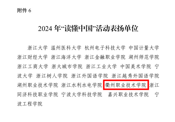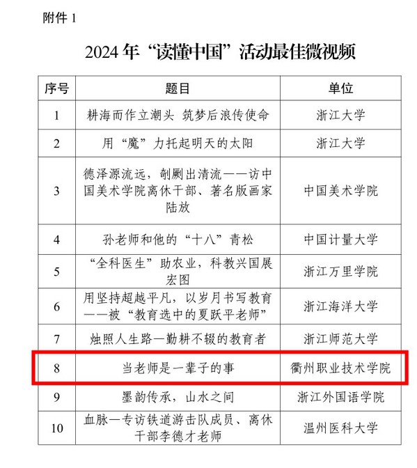 近日,浙江省教育厅关工委公布了2024年“读懂中国”活动入选作品名单,AK体育客户端机电工程学院学生邵天宇微视频作品《当老师是一辈子的事》(指导教师:何韧之)入选2024年“读懂中国”活动最佳微视频,AK体育客户端获评2024年“读懂中国”活动表扬单位。活动开展以来,全省各校积极发动二级学院关工委组织“五老”和学生参与,省教育厅关工委收到微视频135个,评选出最佳微视频10个,AK体育客户端作为唯一一所高职院校脱颖而出,其余9个均为本科院校的作品。