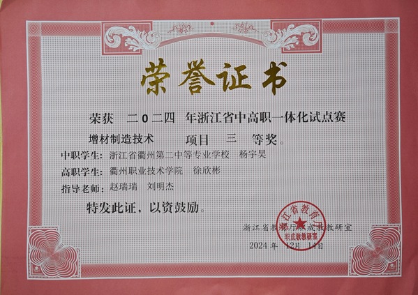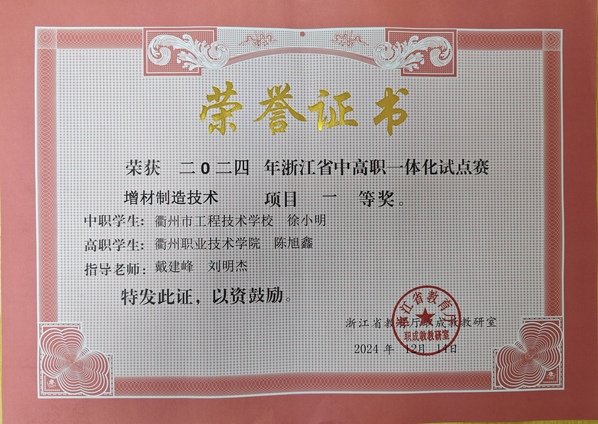 近日,2024年浙江省中高职一体化“增材制造技术”项目比赛在杭州市萧山区第一中等职业学校顺利举行。经过激烈比拼,AK体育客户端机电工程学院刘明杰教师指导的陈旭鑫、徐欣彬2名同学分别与衢州市工程技术学校和浙江省衢州第二中等专业学校2名中职学生组成参赛团队,最终荣获一等奖和三等奖的好成绩。