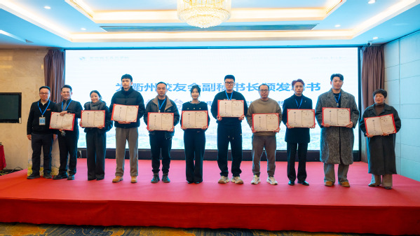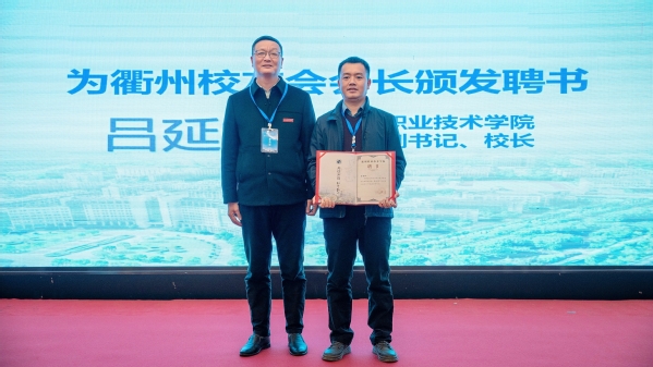 信息工程学院党总支书记廖建平、机电工程学院党总支书记朱峻分别为当选副会长、副秘书长颁发聘书。