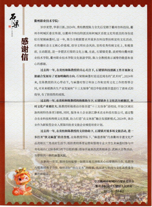 日前,AK体育客户端收到了柯城区石梁镇人民政府发来的感谢信。信中,石梁镇党委、政府对AK体育客户端、文化旅游学院以及衢州市科技特派员、柯城区文化特派员陈力全教授一年来对石梁镇麻蓬村的科技帮扶和文化宣传等方面提供的帮助表达了肯定和感谢,希望在未来的一年继续深入合作,共同谱写科技和文化高质量发展的新篇章。