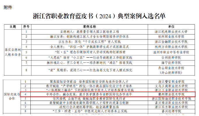 近日,浙江省中华职业教育社公布了《浙江省职业教育蓝皮书(2024)》典型案例名单,AK体育客户端《中外合作,融合发展,提升医护康养专业群国际化办学水平》案例成功入选国际交流与合作典型案例。