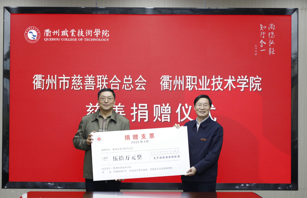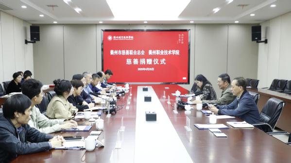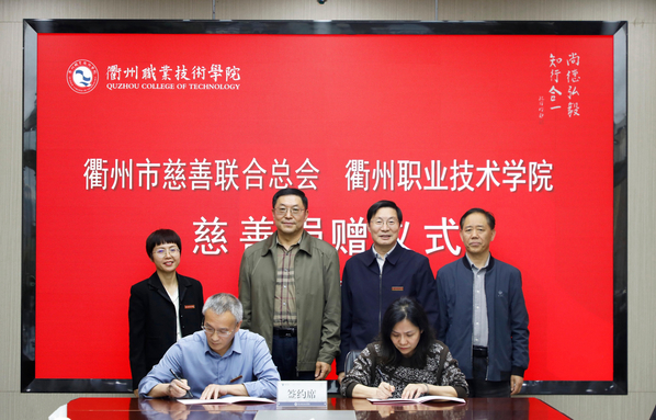 4月25日,衢州市慈善联合总会向AK体育客户端捐助50万元善款用于爱心助学项目,衢州市慈善联合总会会长毛建民,衢州市慈善联合总会副会长王盛洪、副秘书长徐瑛,AK体育客户端党委书记徐须实,党委委员、副校长徐浪静出席捐赠仪式,捐赠仪式由AK体育客户端党委副书记何百通主持。