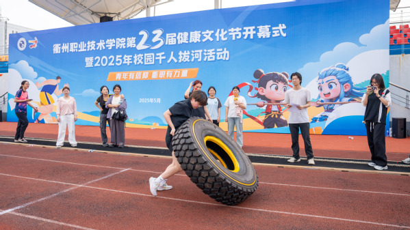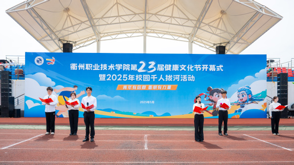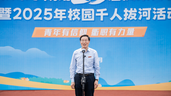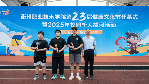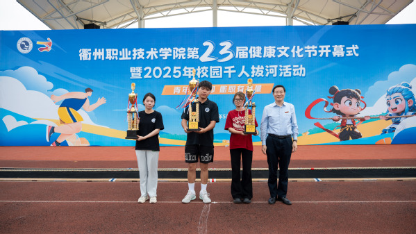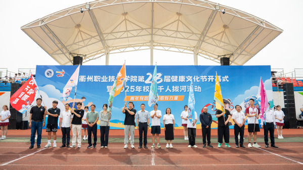吕延文讲话。他表示,学校始终把师生身心健康摆在重要位置,自2002年以来,已连续23年举办“健康文化节”,让健康理念深入人心,健康文化沁润校园。他希望同学们弘扬健康文化,践行“一群人、一根绳、一条心、一起拼、一定赢”的衢职拔河精神,凝聚起推动学校高质量发展的强大精神力量;积极参与文体活动,共建健康向上、朝气蓬勃的校园文化氛围;培养良好运动习惯,在学习之余关掉电脑、放下手机,走上运动场,释放压力、强健体魄,以更加饱满的状态迎接每一天的学习与生活。