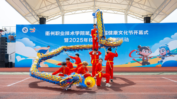 舞龙表演与朗诵节目《青年有信仰 衢职有力量》展现了衢职学子昂扬的精神风貌与深厚的文化自信。