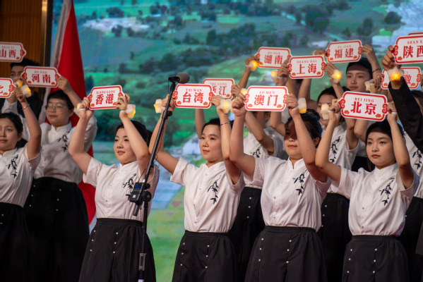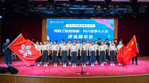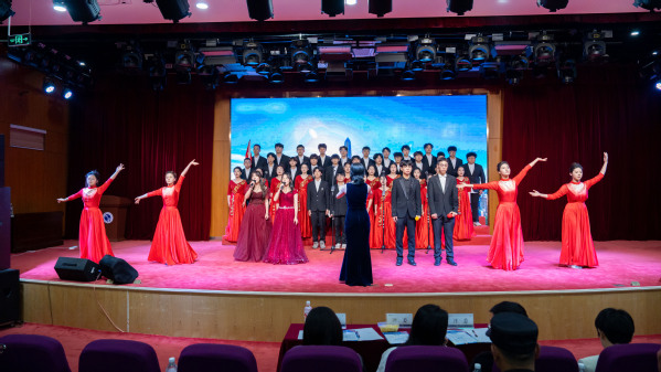 医学院24中药1班带来的《紫荆花盛开》,以合唱、手势舞、钢琴与舞台剧相结合的方式拉开演出序幕,寓意祖国繁荣昌盛。