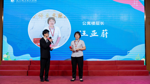 学生代表为校园守护者——保安队长舒敬华、公寓楼层长汪亚蔚、保洁组长周秀秀、电工徐雪红、保安员姚建国献花,致敬他们的默默付出。