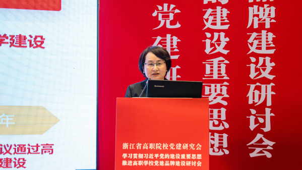 浙江商业职业技术学院党委副书记应金萍作题为《五力推进职业院校党建高质量发展》的经验分享。