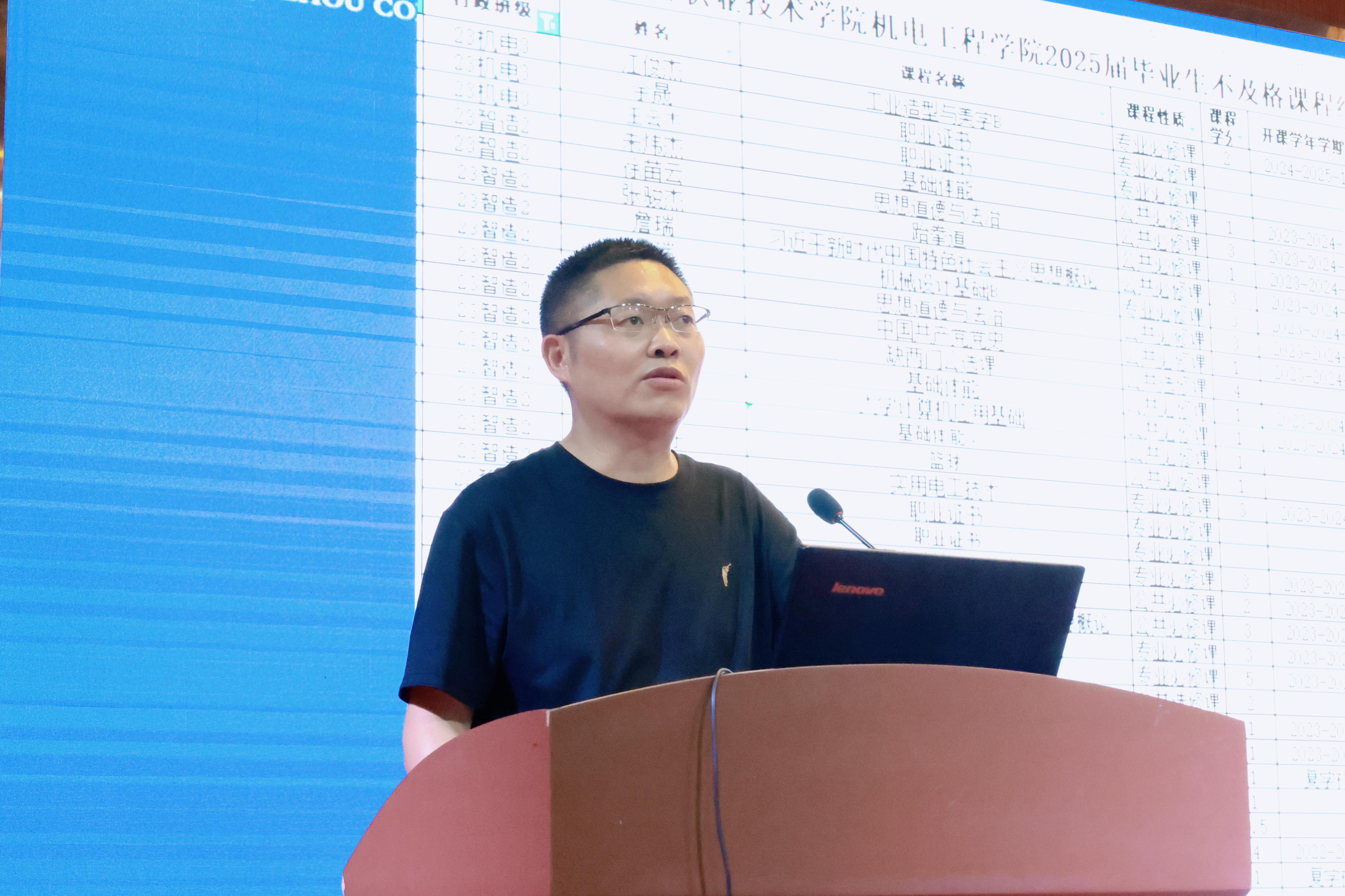 副院长徐文俊通报2025届毕业生学业审核情况,说明毕业生学业情况和事项说明,以及强调职业资格证书是毕业关键环节。此外,徐副院长以学科竞赛获奖案例激励学生主动规划学业,通过参与“互联网+”“机械设计大赛”等相关竞赛提升专业技能,提升自我技术能力范围。