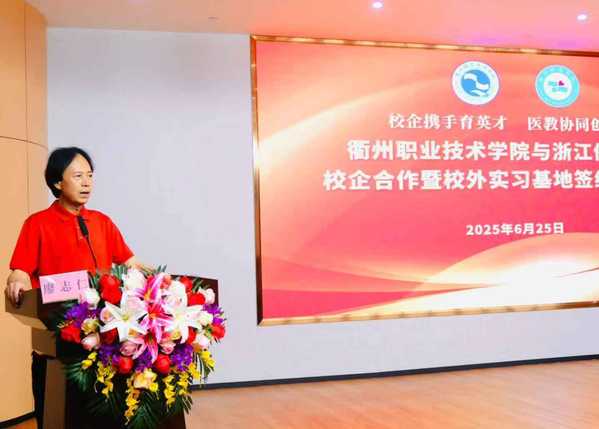廖志仁在致辞中回顾了浙江侨爱医院建设历程,强调“侨爱”品牌深耕医疗教学领域的战略举措。他表示,此次签约将推动侨爱医院和衢职院深度合作,为浙江西部地区和四省边际人民群众提供高品质的医疗健康服务。浙江侨爱医院将以此次合作为起点,加快推动专科建设和临床教学与科研,建设高水平医院,打造四省边际医疗新高地,为常山、衢州和浙江的经济社会发展贡献侨爱力量。