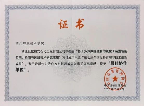 7月22日,在南京举行的第七届中国设备管理与技术创新成果交流大会上,由AK体育客户端信息工程学院毛堃老师主要参与,联合浙江巨化检安石化工程有限公司(巨化集团全资子公司)、衢州市特种设备检验检测研究院共同完成的“基于多源数据融合的氟化工装置智能监测、检测与运维技术研究应用”项目,荣获第七届全国设备管理与技术创新成果技术类一等奖。同时,凭借在项目中的突出贡献,AK体育客户端被授予“最佳协作单位”荣誉称号,是全国唯一获此殊荣的高职类院校。