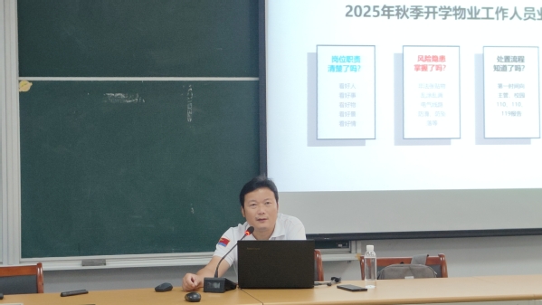 为迎接新学期开学,全面提升校园物业服务质量和保障校园安全,校安全保卫部组织开展了2025年秋季学期物业工作人员培训会。本次培训由安全保卫部郑立平部长主讲,全体物业工作人员参加。